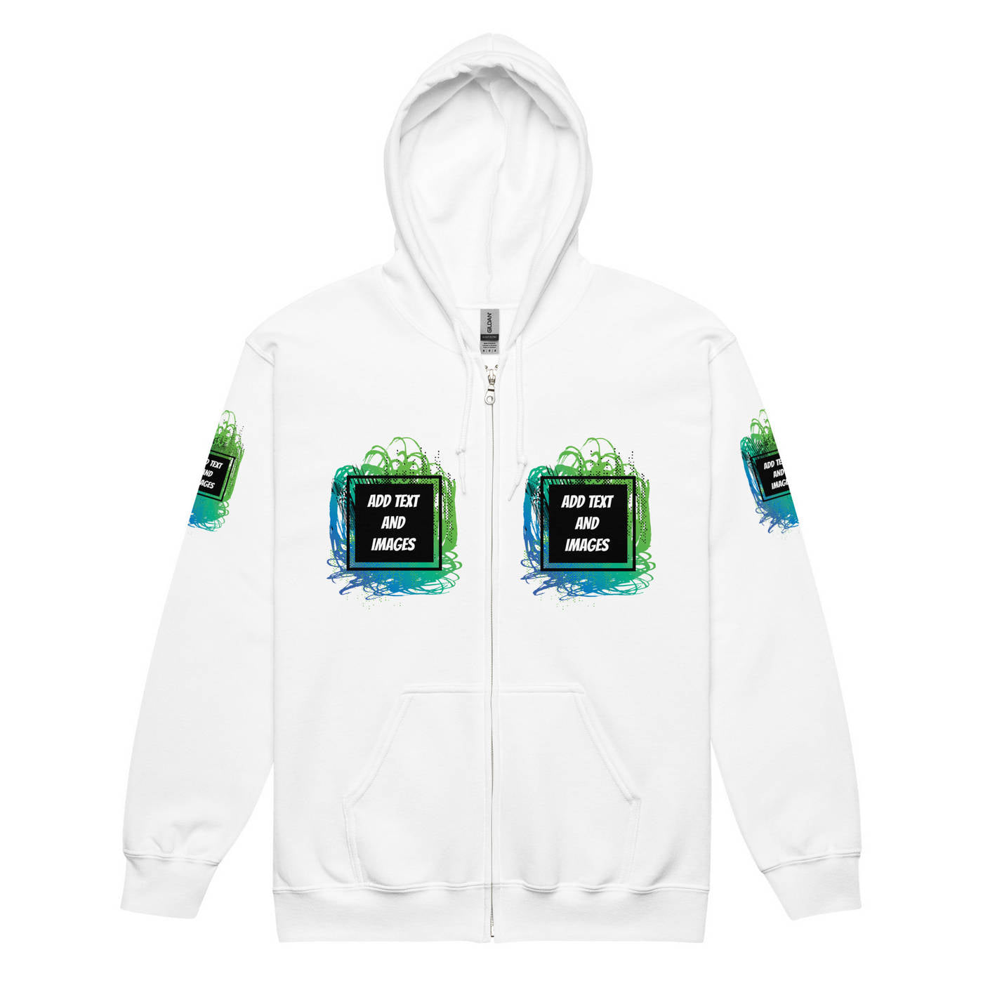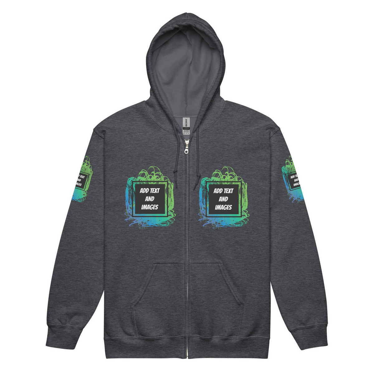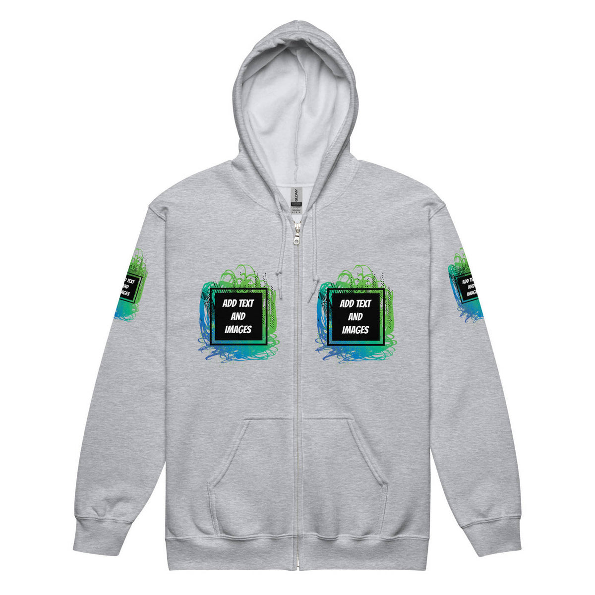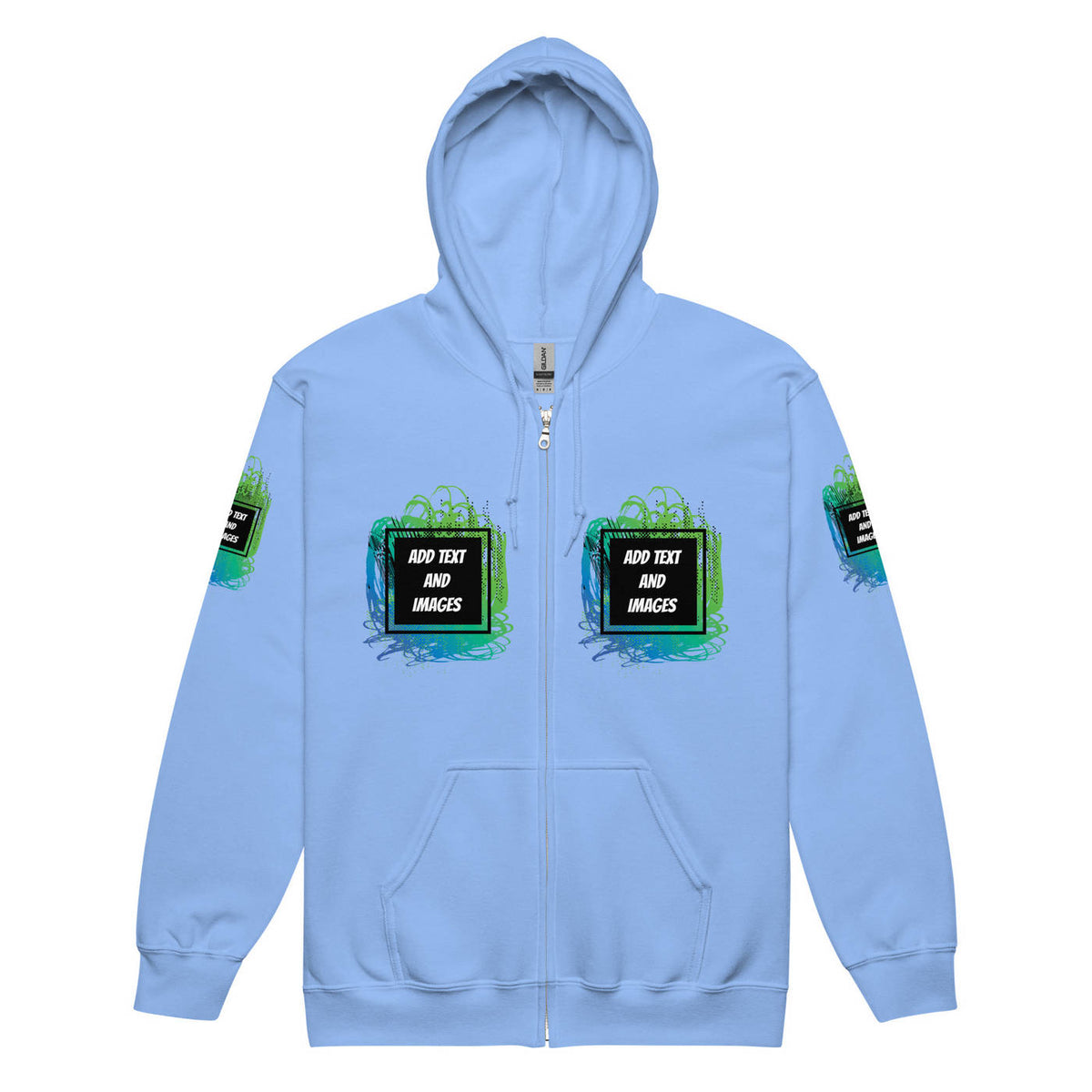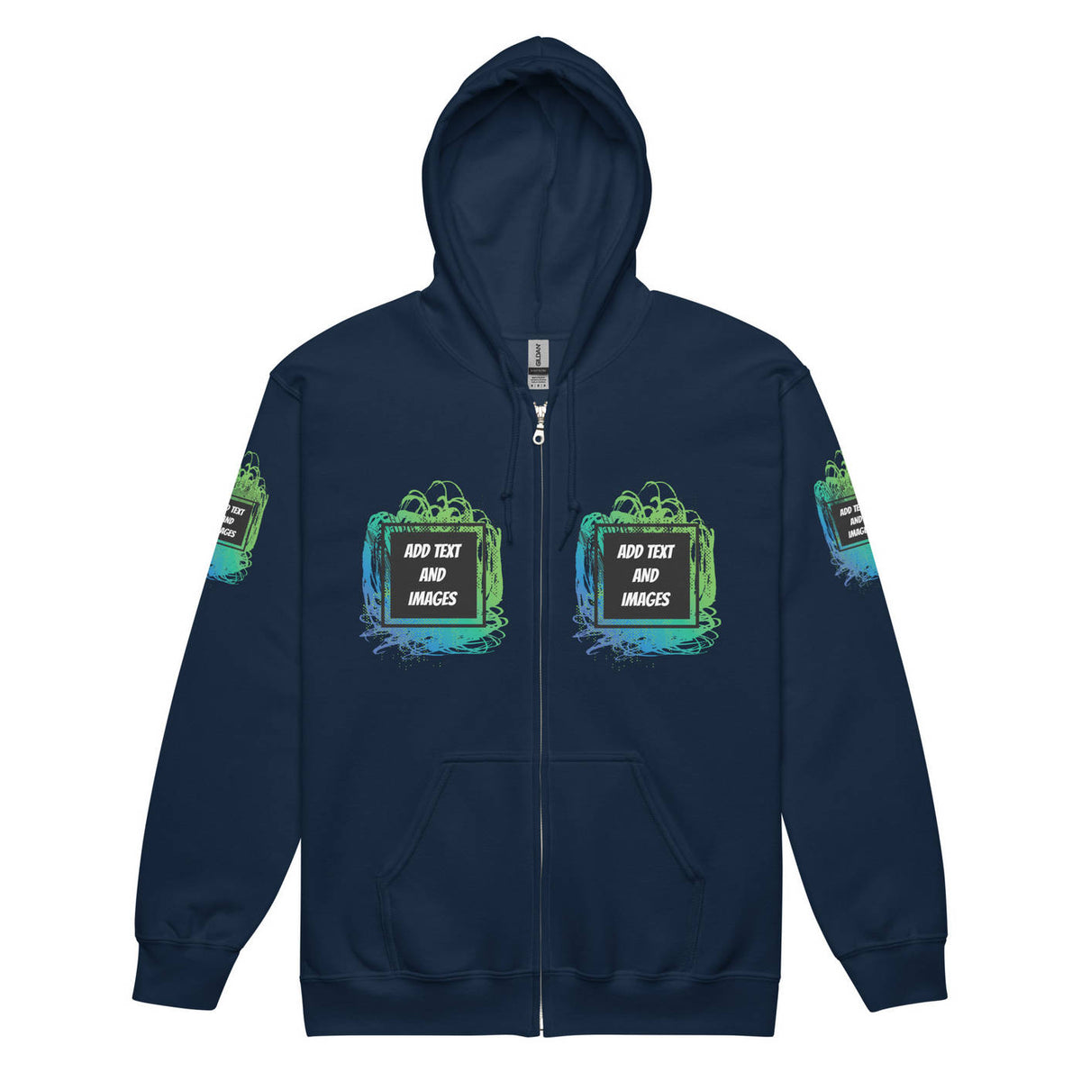 Be comfy and hip when you design your own Unisex Everyday Heavy Blend™ Full-Zip Hooded Sweatshirt from Gildan. Add graphics and text to the front, back and sleeves for the most custom zip-up hoodie out there.