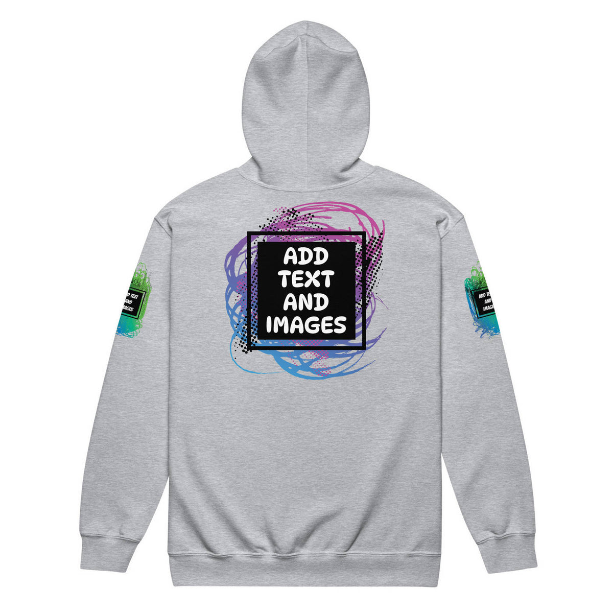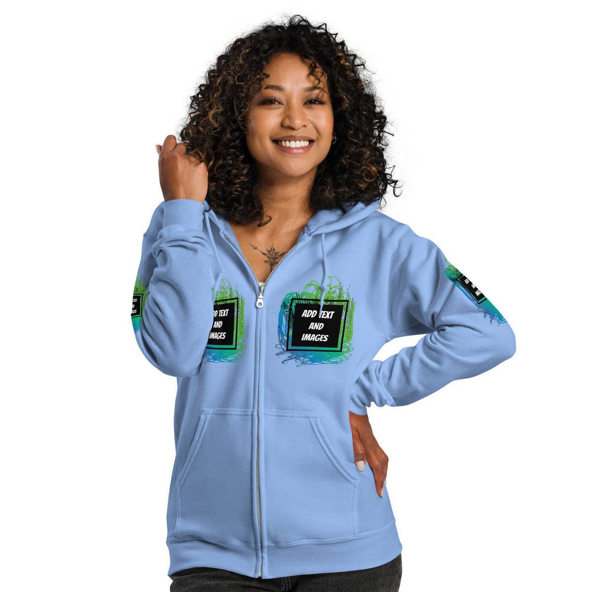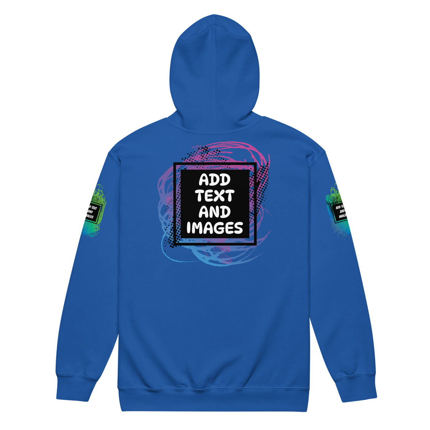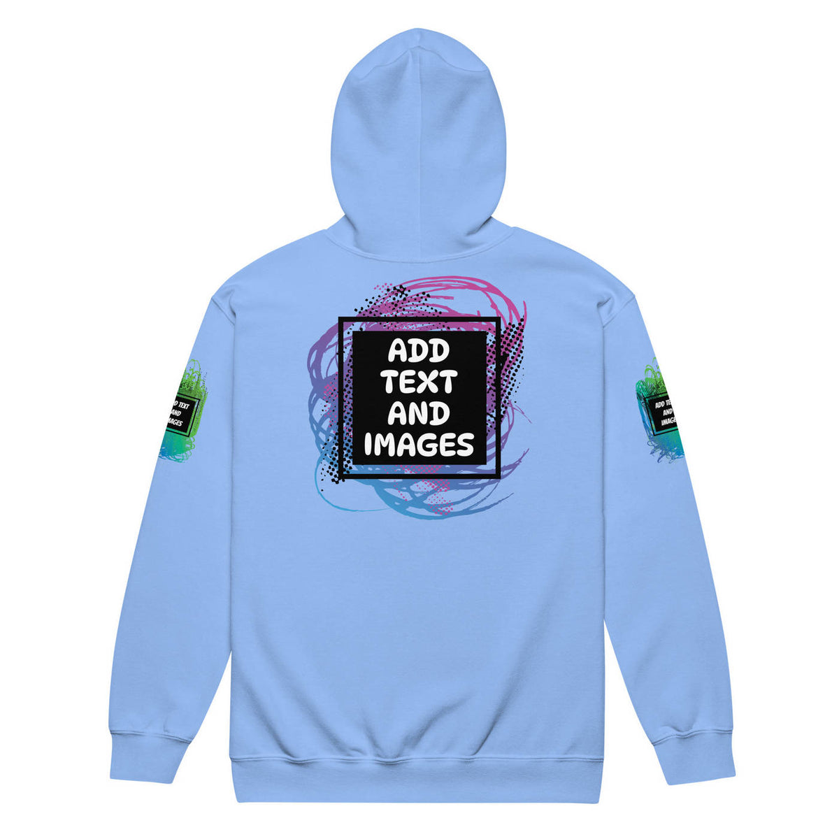 Be comfy and hip when you design your own Unisex Everyday Heavy Blend™ Full-Zip Hooded Sweatshirt from Gildan. Add graphics and text to the front, back and sleeves for the most custom zip-up hoodie out there.