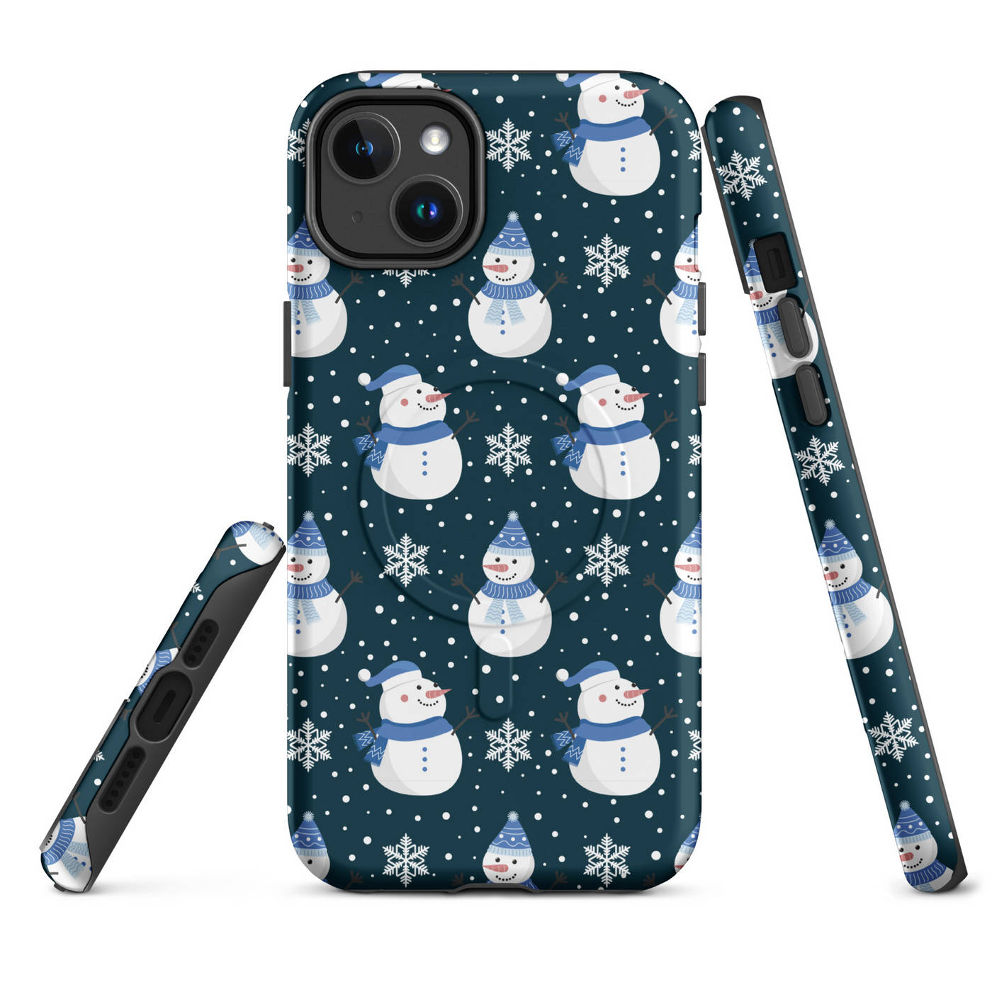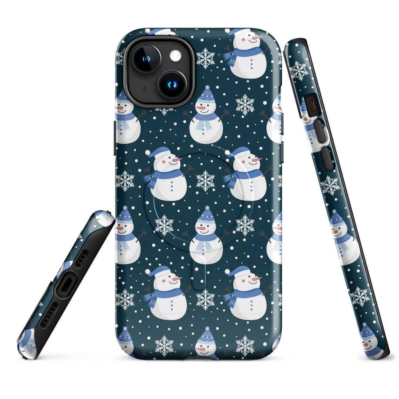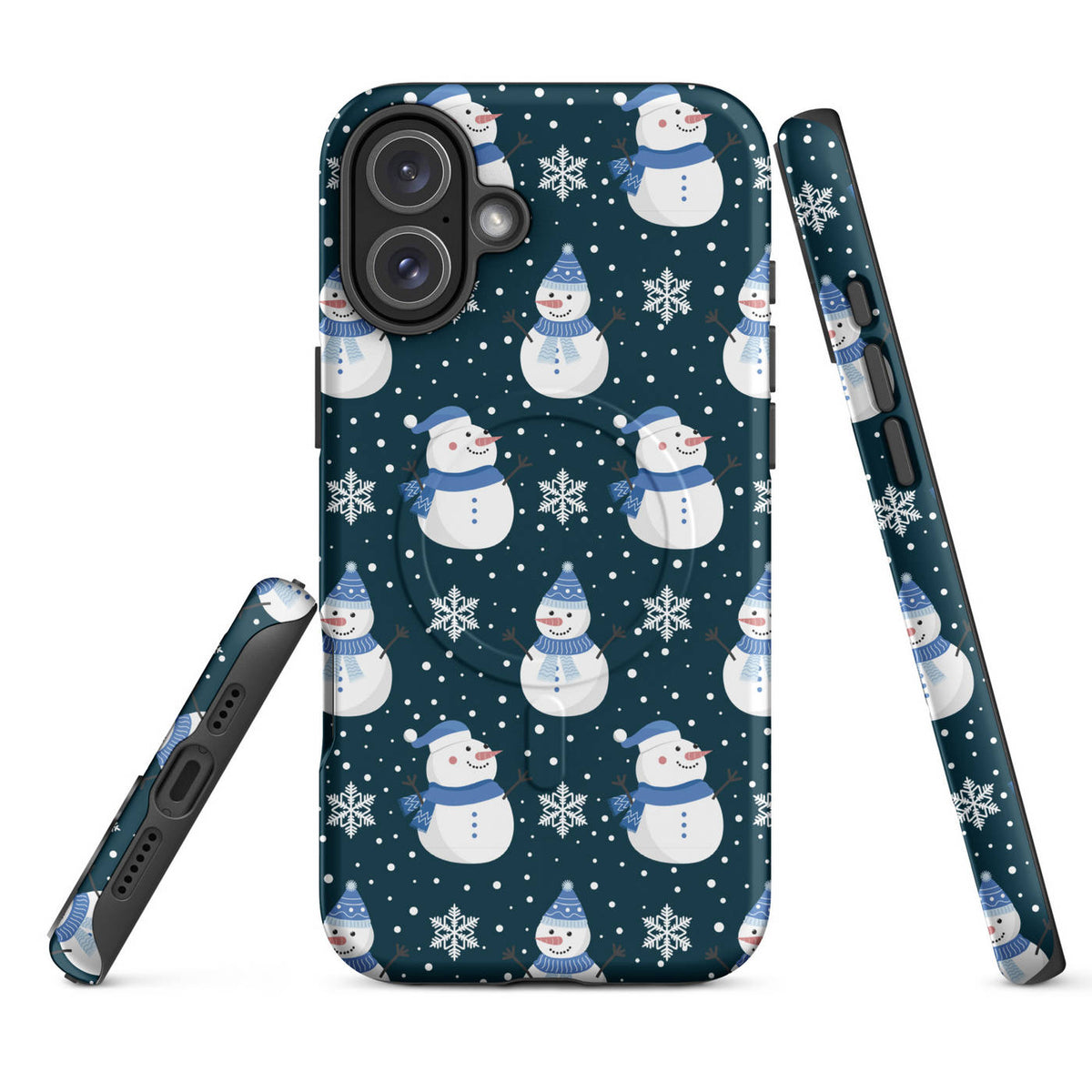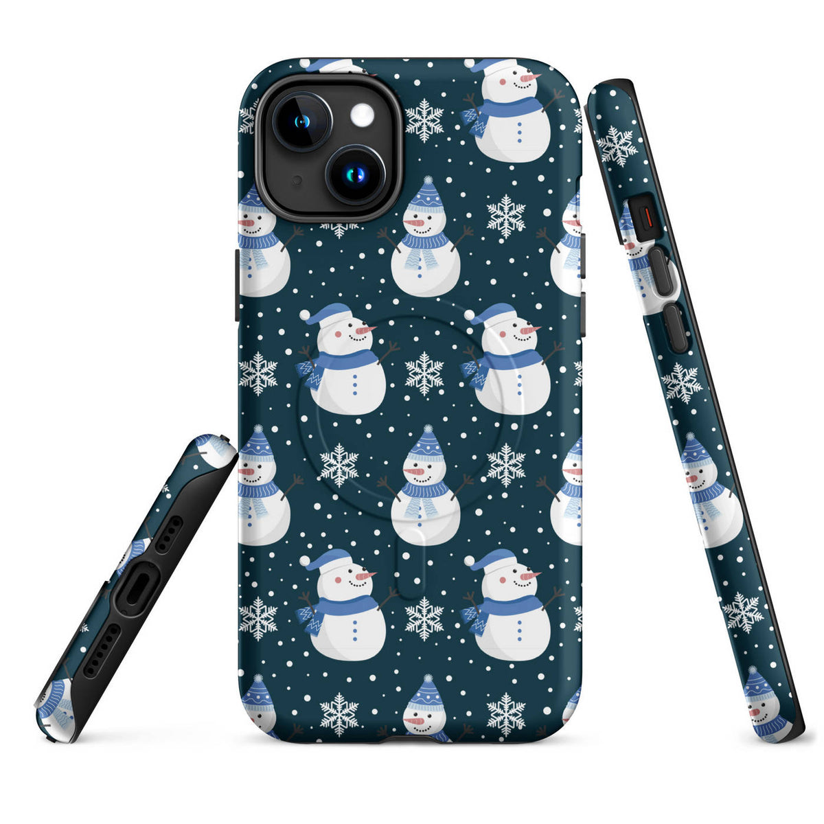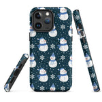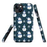 This Apple iPhone® MagSafe® Tough Case from Custom Exclusives has been pre-designed with a winter themed Blue Scarf Snowman pattern design on a dark blue background.