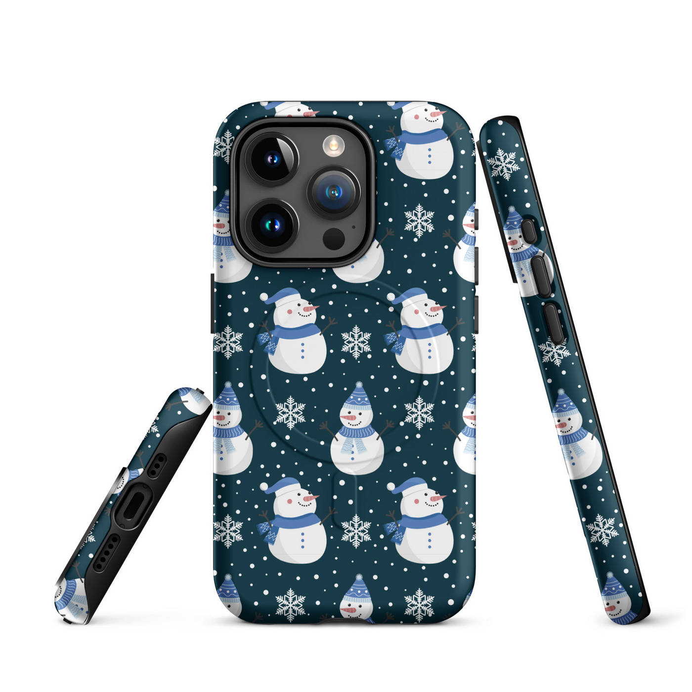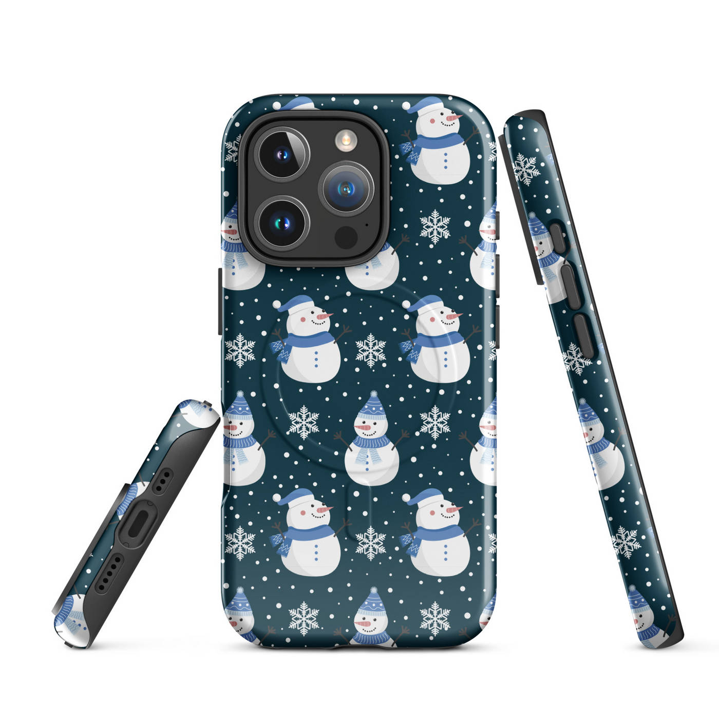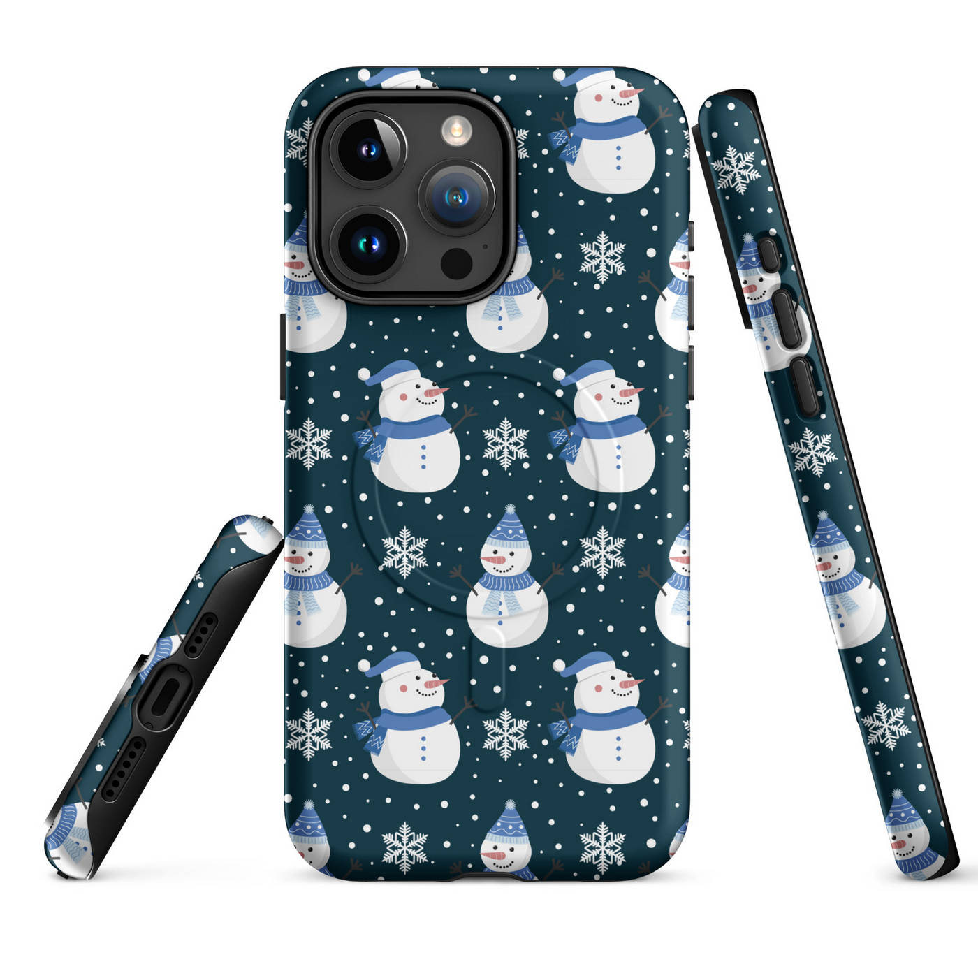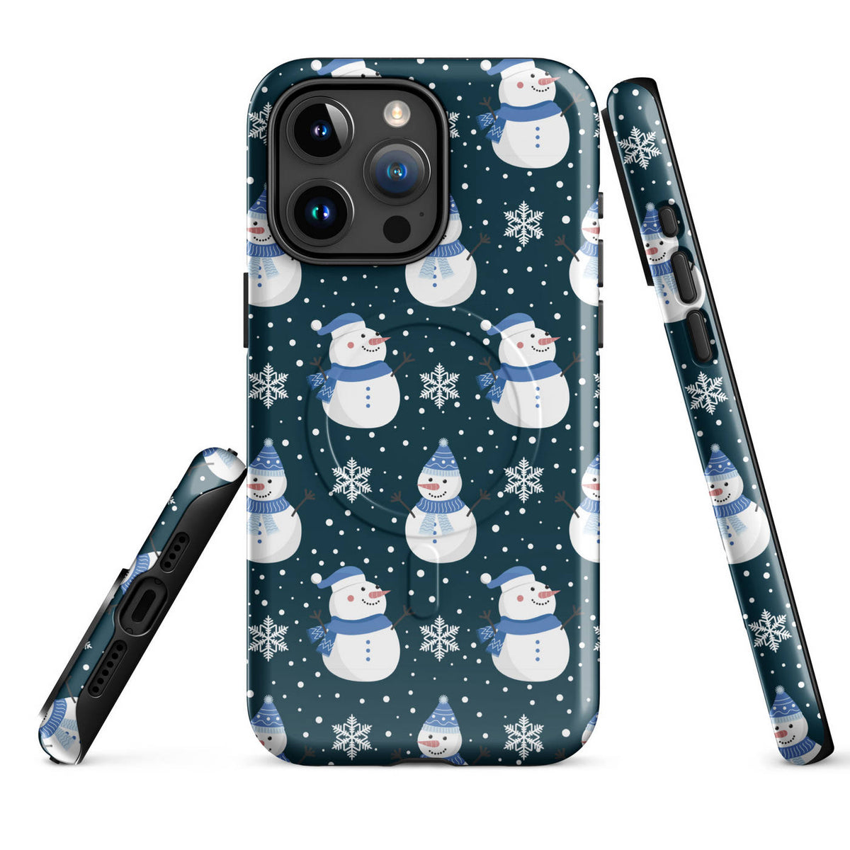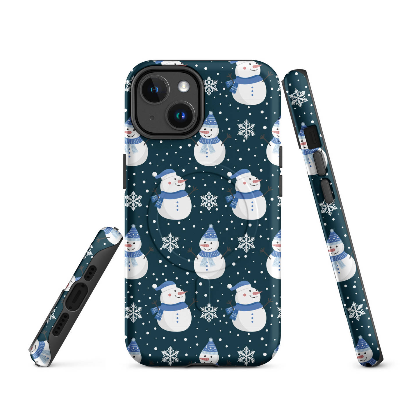 This Apple iPhone® MagSafe® Tough Case from Custom Exclusives has been pre-designed with a winter themed Blue Scarf Snowman pattern design on a dark blue background.